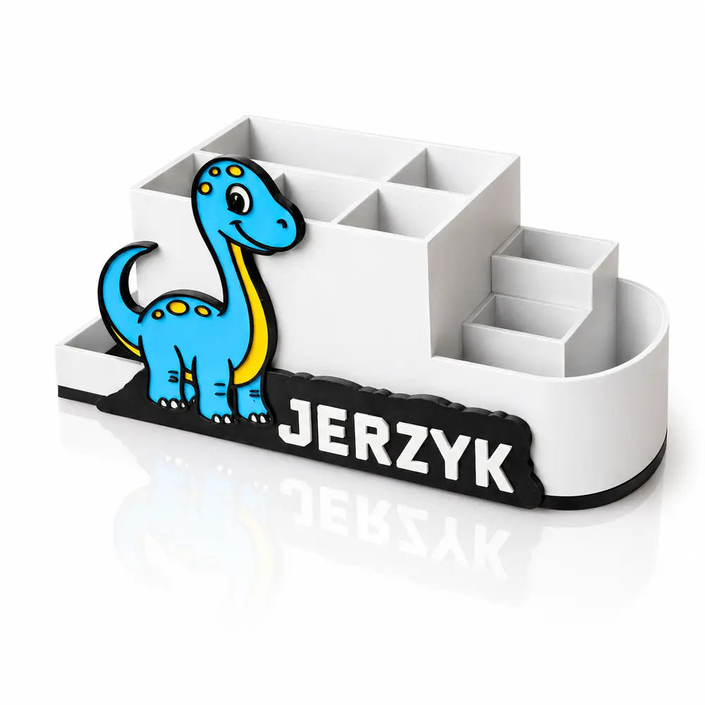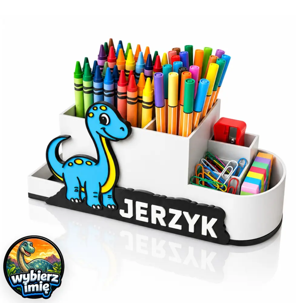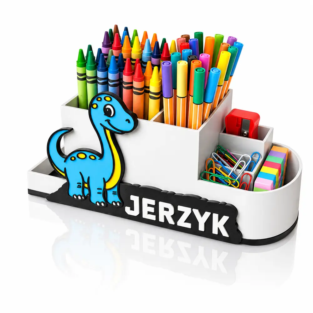 To nie jest zwykły kubek na długopisy – to prawdziwe, spersonalizowane centrum dowodzenia, które z powodzeniem rośnie razem z potrzebami Twojej pociechy. Dzięki wykorzystaniu najwyższej jakości wykonania i użyciu innowacyjnych, ekologicznych materiałów z druku 3D, zyskujesz pełną pewność, że inwestujesz w produkt wytrzymały, bezpieczny dla zdrowia i w stu procentach przyjazny dla naszej planety. Zobacz na własne oczy, jak osobiste imię umieszczone tuż obok przyjaznego zwierzaka skutecznie motywuje malucha do utrzymywania czystości i sprawia, że codzienna nauka staje się fascynującą, prehistoryczną przygodą!