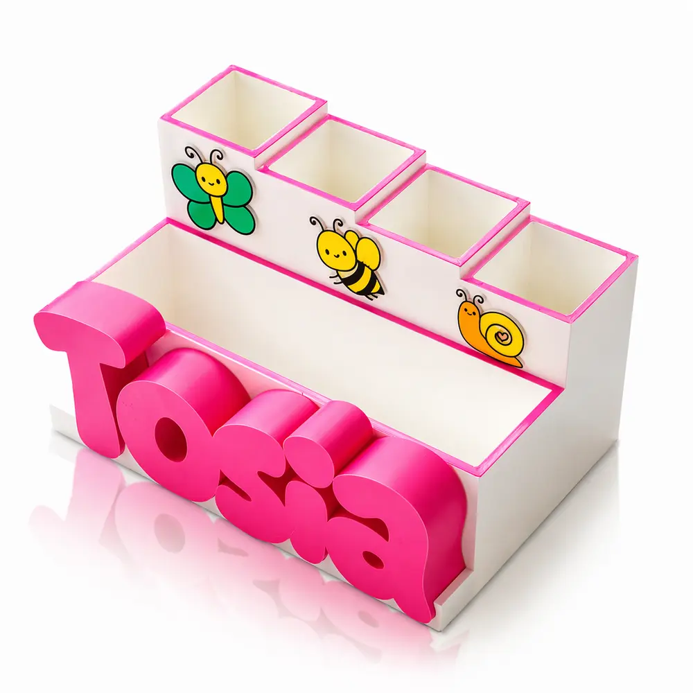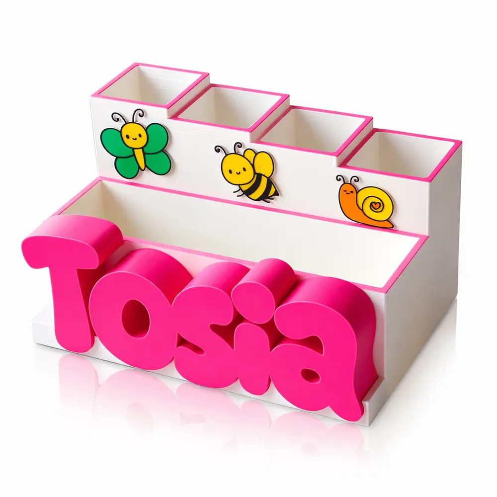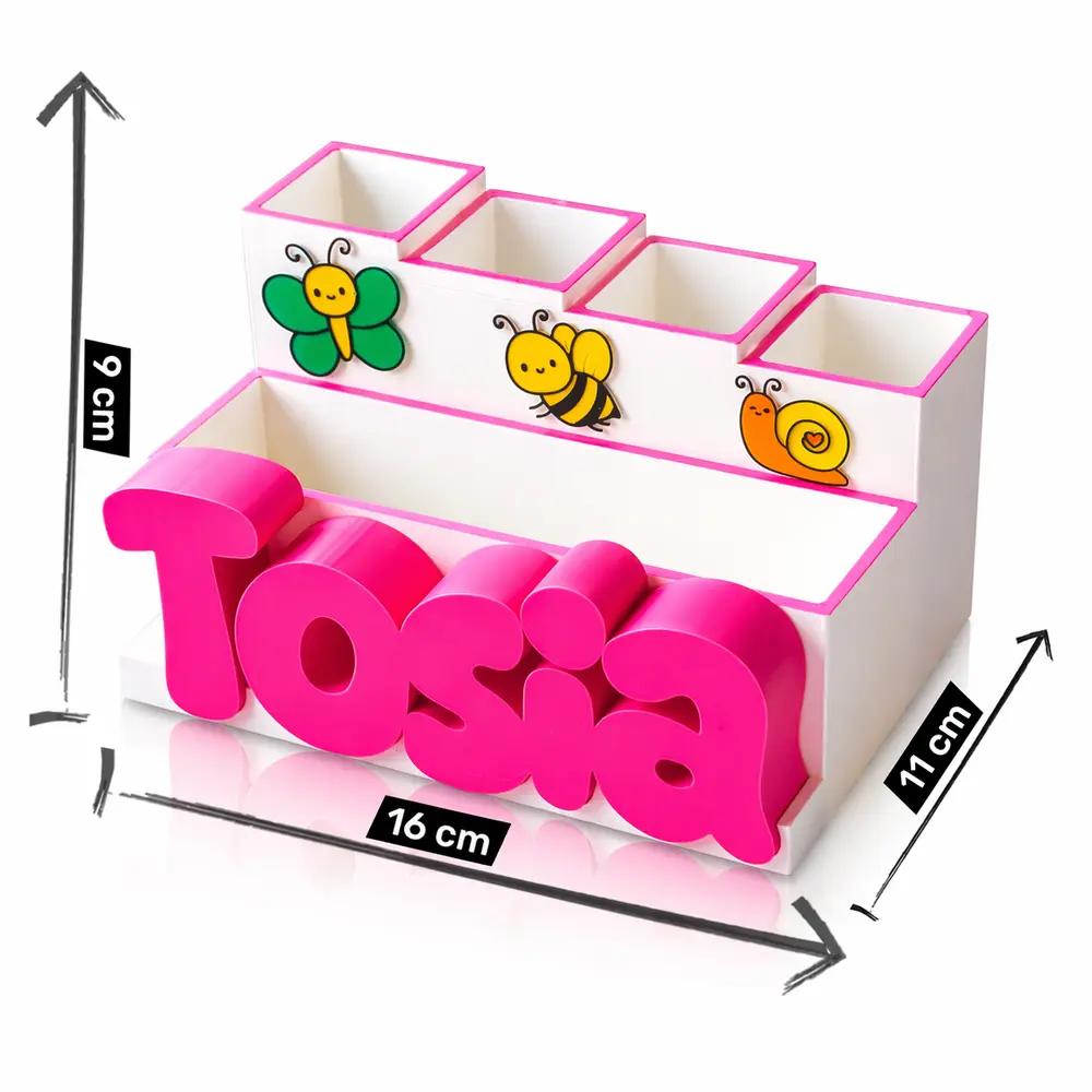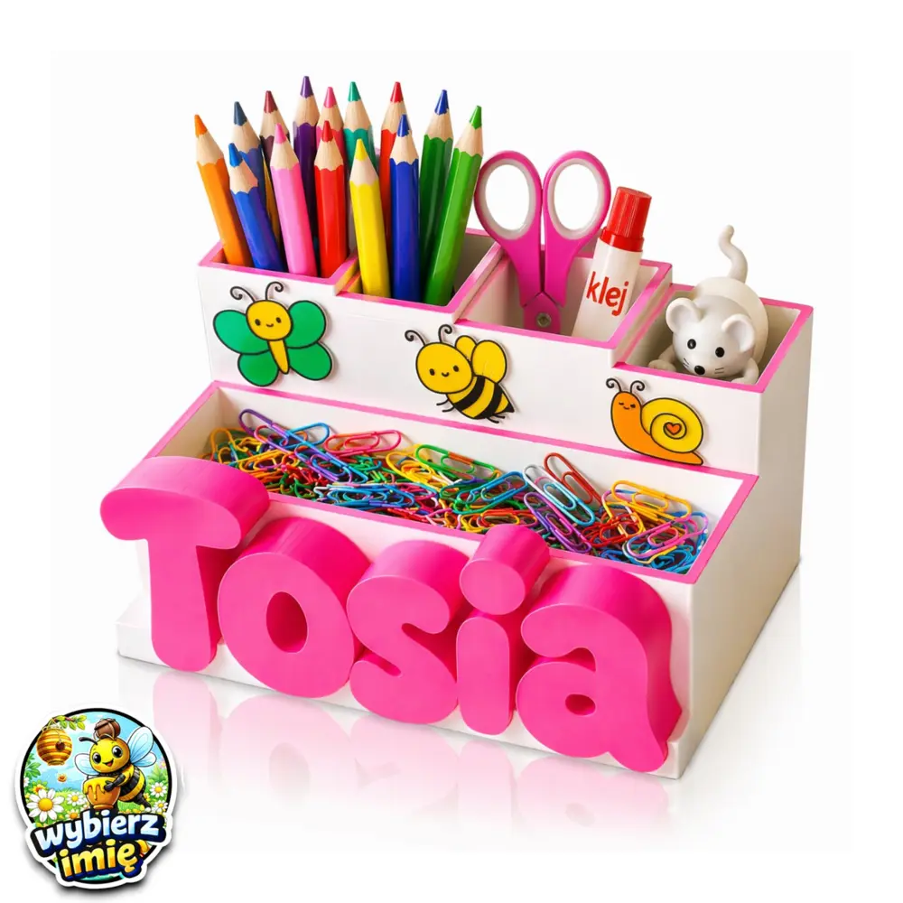 Pojemnik bazowy występuje w kolorze pięknym, matowo-białym z jasnoróżowymi ramkami, natomiast bajkowe owady charakteryzują się intensywnymi, radosnymi barwami. Prawdziwą magią jest jednak personalizacja – umieścimy na przyborniku imię dziecka wykonane w intensywnym różowym kolorze i stylowej, bajkowej czcionce. To dlatego nasz przybornik jest tak wspaniałym pomysłem na prezent z okazji urodzin czy Dnia Dziecka.