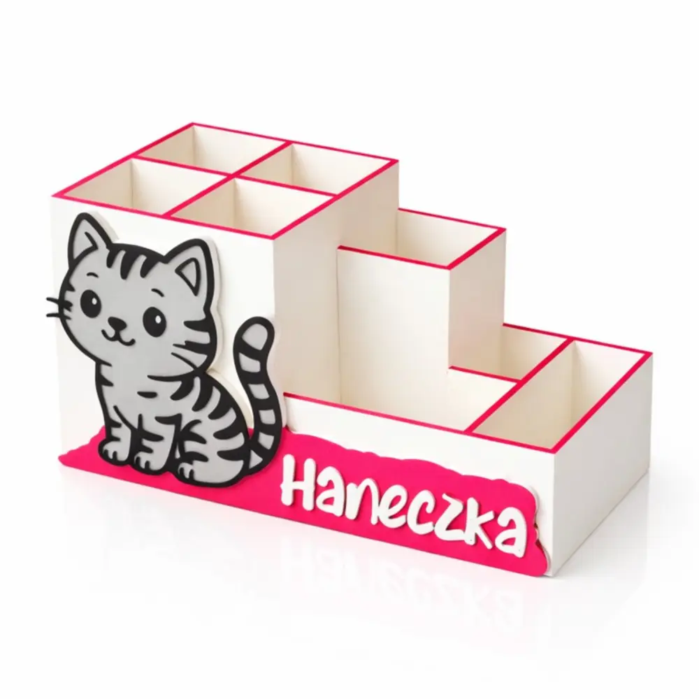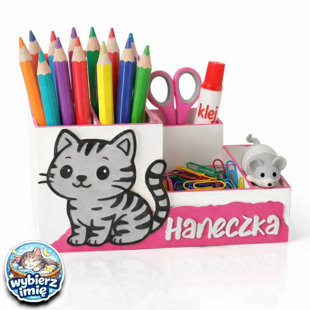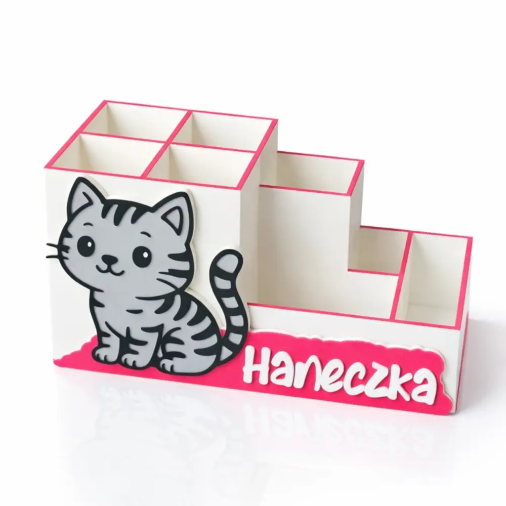 Decydując się na organizer na biurko kotek w paski, inwestujesz w genialną, trójwymiarową dekoracje do zarządzania przestrzenią na blacie biurka. Głębokie komory z tyłu i płytsze na przodzie pozwalają na idealne posegregowanie wszystkich akcesoriów. Dziecko nie musi już wysypywać wszystkiego z klasycznego piórnika, by znaleźć ulubioną, czerwoną kredkę – teraz każda rzecz jest dobrze widoczna i na wyciągnięcie ręki. Biel pojemnika w połączeniu z różowymi detalami oraz kontrastującym, przestrzennym szarym kotkiem z ciemnymi prążkami daje niesamowity, bardzo nowoczesny efekt wizualny. To absolutny must-have na biurku każdego ucznia i przedszkolaka. Podaruj dziecku ten uroczy, spersonalizowany przybornik z imieniem i spraw, aby nauka organizacji była równie wciągająca, co zabawa z ulubionym pupilem!