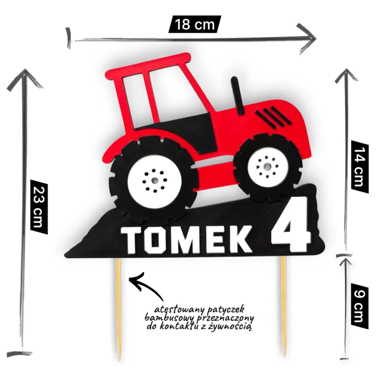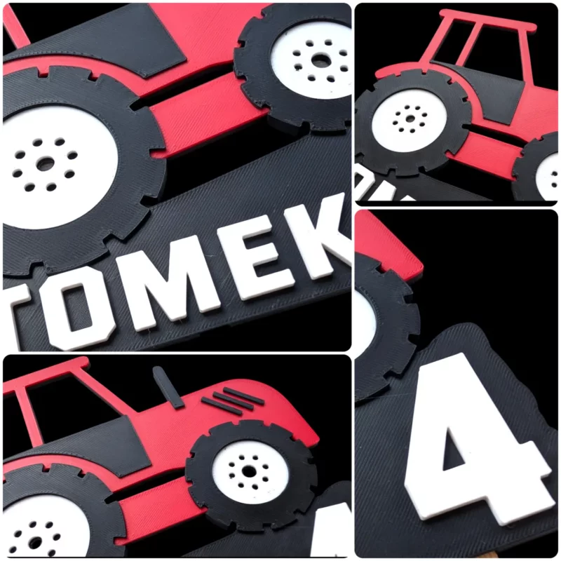 • Grubość: traktor ma 3mm grubości, czarne elementy (koła i detale) to 4mm grubości co sprawia, że wystają poza traktor tworząc efekt przestrzeni, spersonalizowany biały napis z czarnym podkładem ma aż 5mm